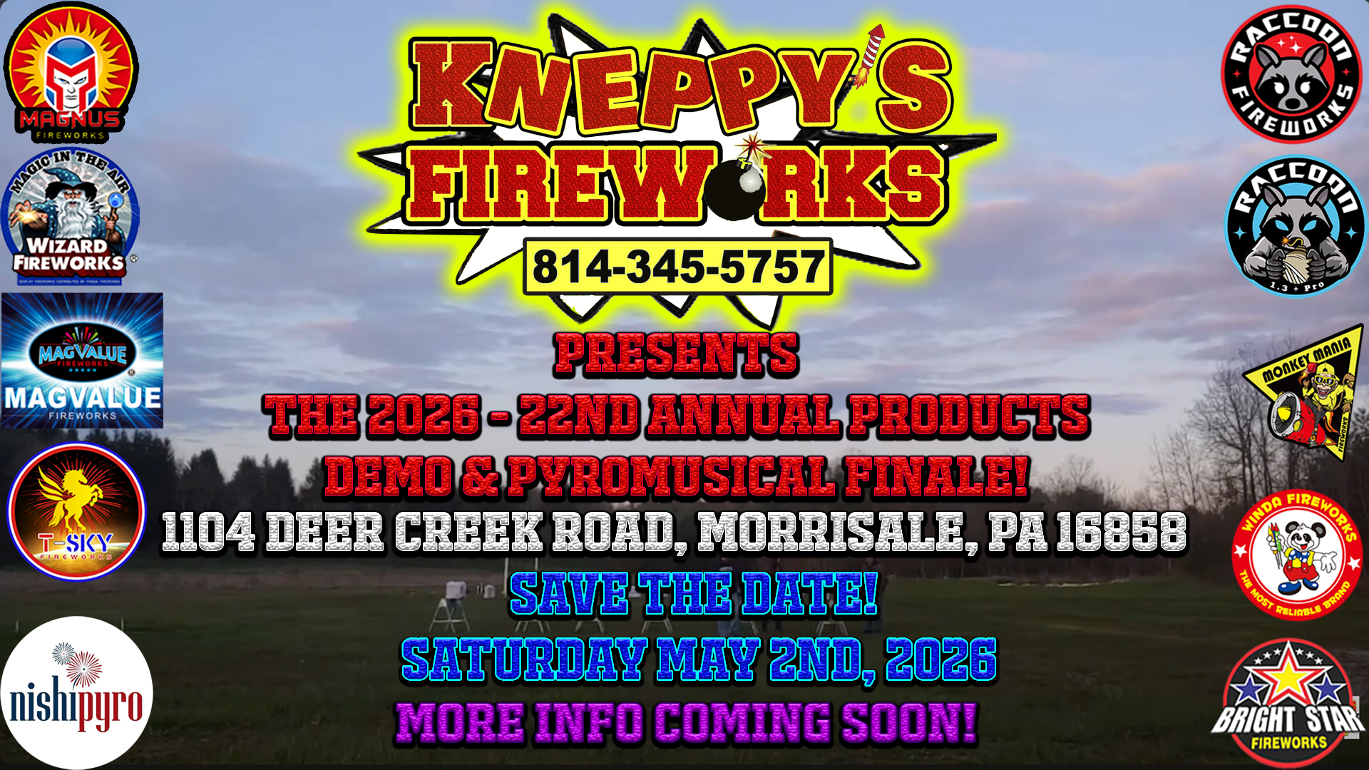 WELCOME TO KNEPPY’S FIREWORKS INC. We are a small fireworks store located in the heart of central PA with a huge variety of fireworks types to meet all your summer festivities, birthdays, gender reveals, and other holidays that you celebrate. If it has a fuse we probably have it. We have sparklers, smoke items, strobes, crackles, toys/novelties, fountains, sky lanterns, sky fliers, parachute items, rockets & rocket varities, firecrackers, roman candles, 200g cakes, 500g cakes and aerial shells up to 1.75″ diameter/7″ length. Wholesale cases are available upon request. Wholesale Catalog is available on the menu above. Call us or contact us and we’ll do our best to accomidate your every fireworks needs. The more you buy the more you save. Thank you for choosing us to make your celebrations super ultra special and memorable.